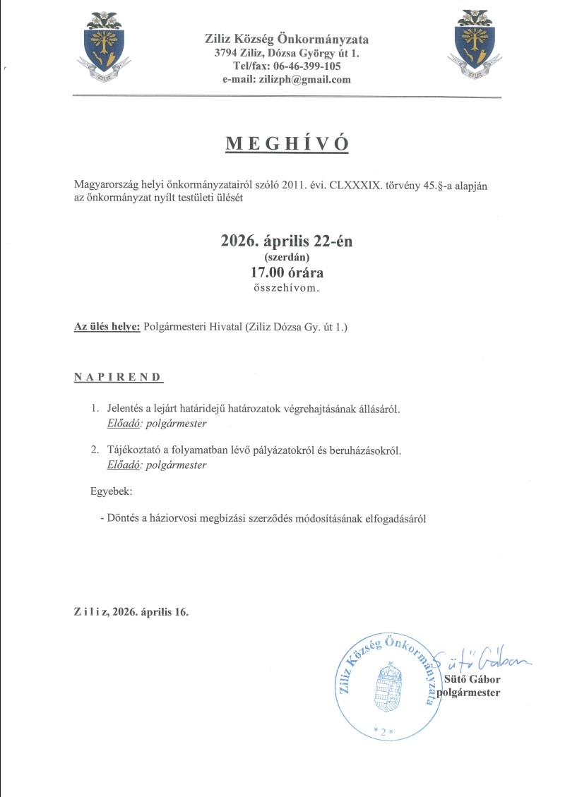 elfogadásra Ziliz Község Önkormányzatának Képviselő-testülete